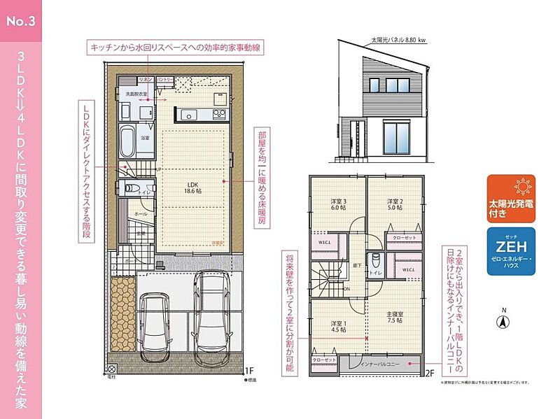 ●家族構成の変化や使い方に合わせて将来的に2部屋に分割することが可能な可変型間取り