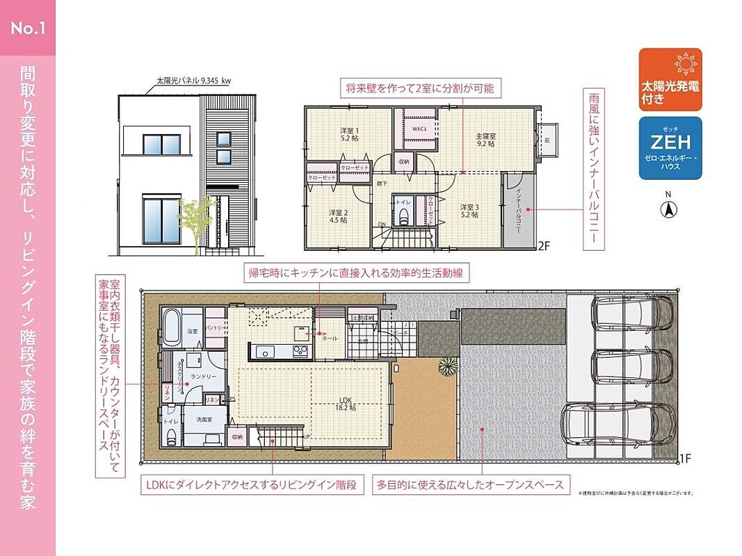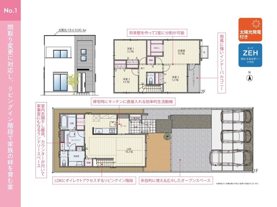 ●家族構成の変化や使い方に合わせて将来的に2部屋に分割することが可能な可変型間取り
