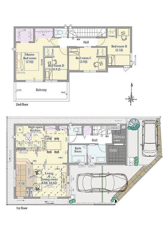 全邸110m2を超えるゆとりある面積を確保し、カースペース2台を採用しました。