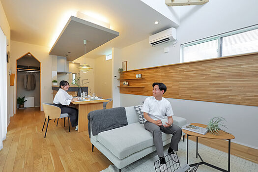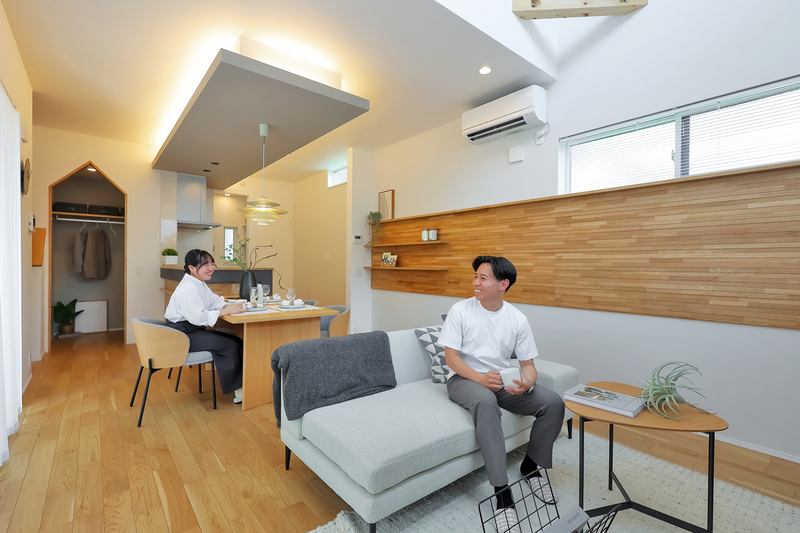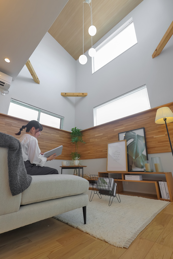リビングには開放的な吹き抜けがあり、明るさを感じる空間になっています。室内のグには開放的な吹き抜けがあり、明るさを感じる空間になっています。室内の随所に素材感あるアイテムを散りばめ、フォレストレらしいあたたかみある空間をつくりました。