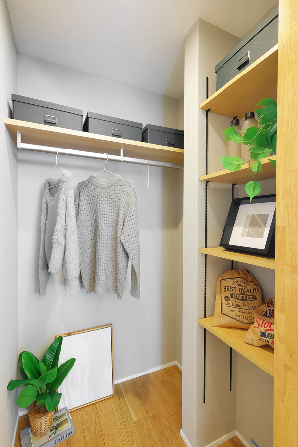 玄関のシューズクロークやキッチン前のファミリークローク。キッチン横のパントリーなど適材適所の収納が充実しており、部屋がスッキリ片付きます。