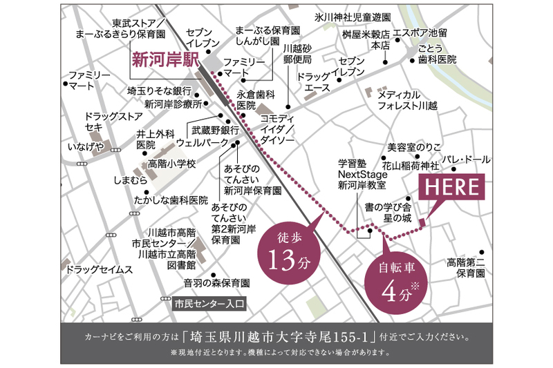 - ※物件から周辺のお店・施設までの距離は、利用が想定される道路を通行した場合の距離です。なお、必ずしも最短距離を保証するものではありません。