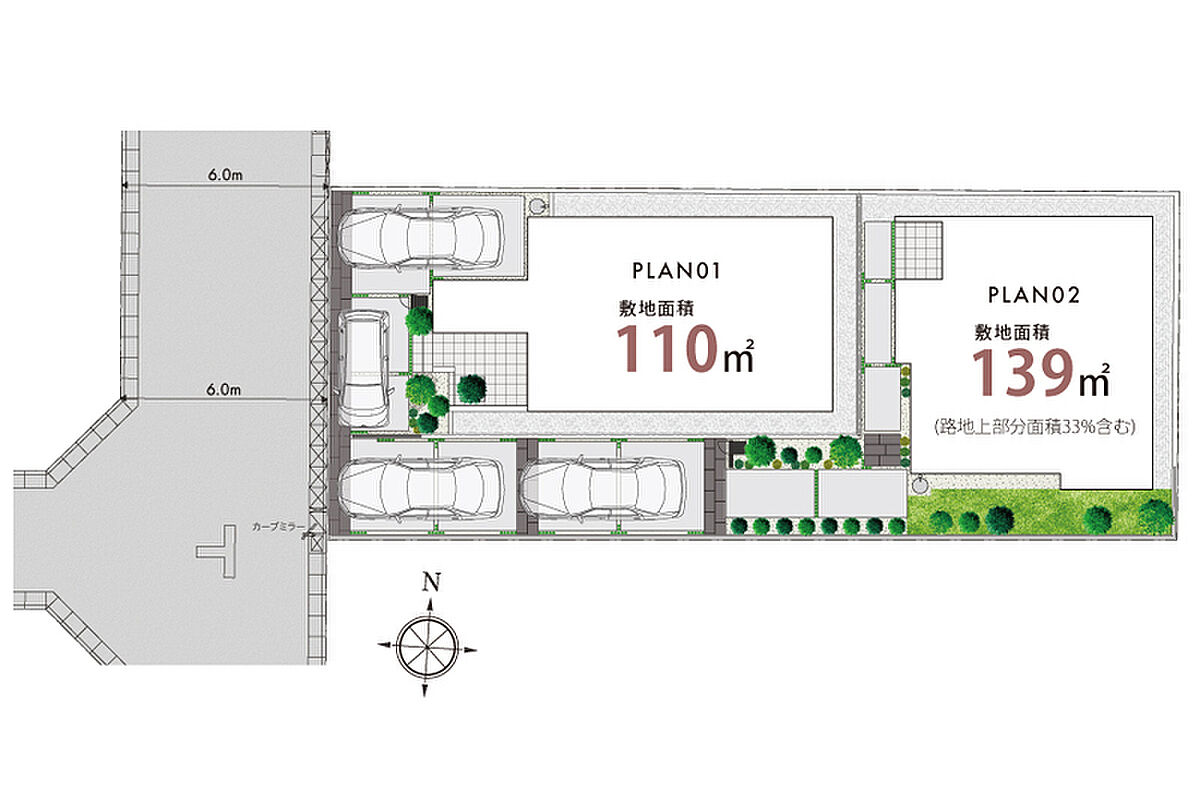 ■前面道路6.0mに面し、ゆとりある敷地面積で開放的な街並み。