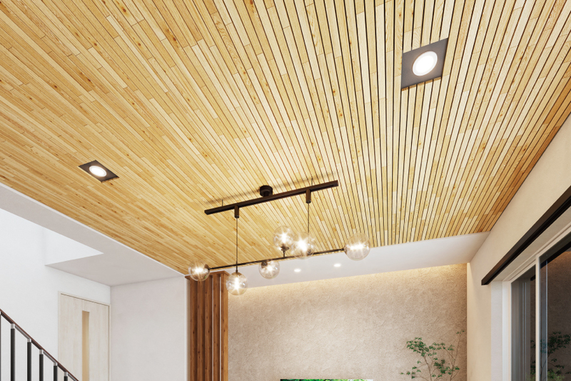 リビングの天井に木の質感を感じるパネルをあしらいました。優しく...