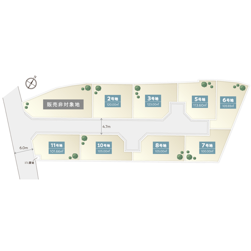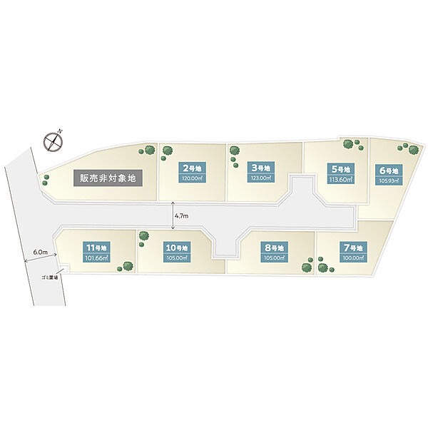 ・約4.7m開発道路、南西側約5.4m~約5.7mに面し、駐車2台可能(車種による)。