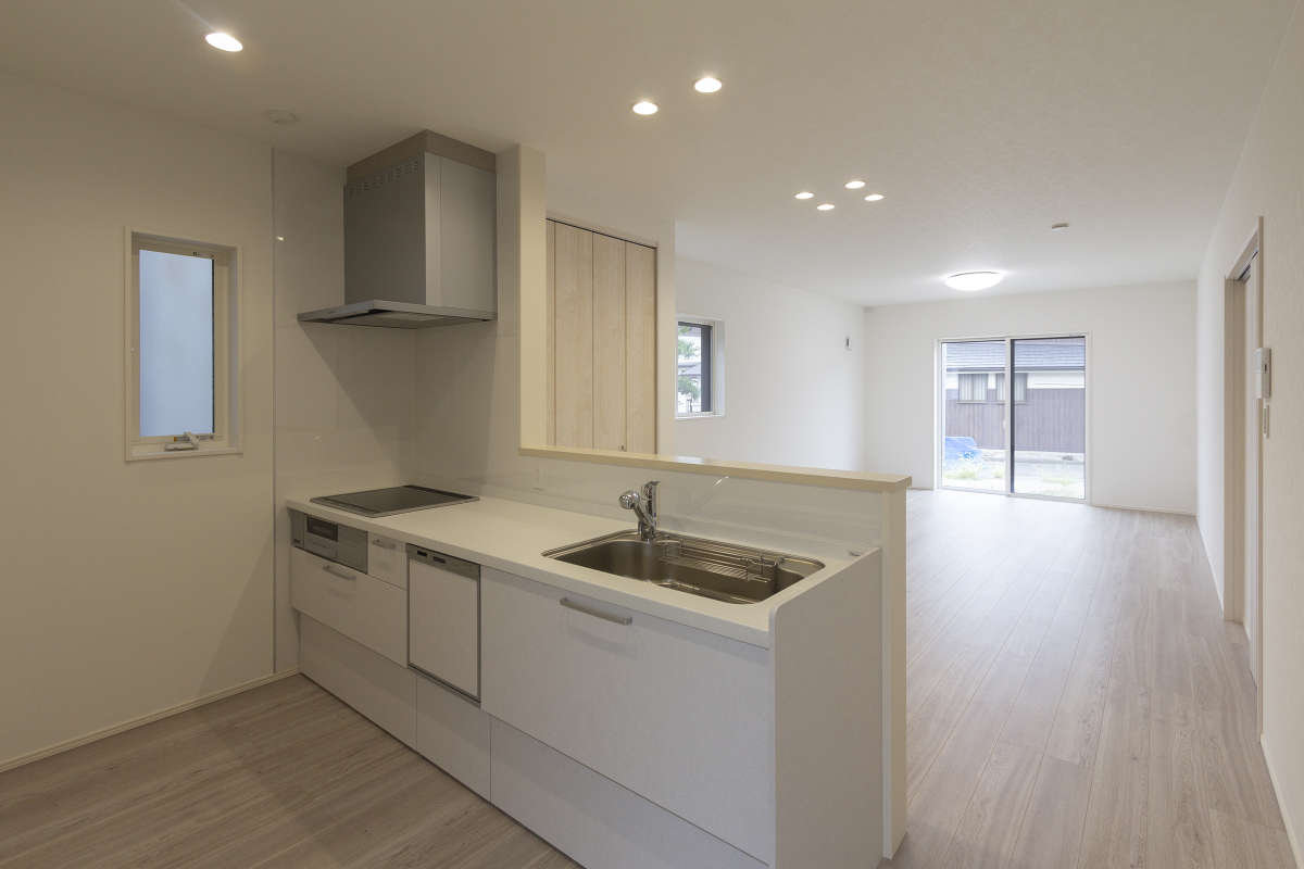 リビングやダイニングへ見通しが良く、調理中でもご家族とコミュニケーションが取りやすい対面式。食器洗い乾燥機を備えています。キッチン横パントリーは食料品や調理器具をまとめて収納いただけます