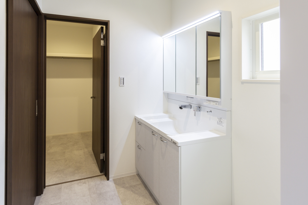 洗面化粧台は3面鏡&ハイバック水栓タイプ。ミラー裏や下部収納にアメニティーが収まるだけでなく、洗面所にも収納スペースを設けており、日用品や小物をすっきり整理できます。