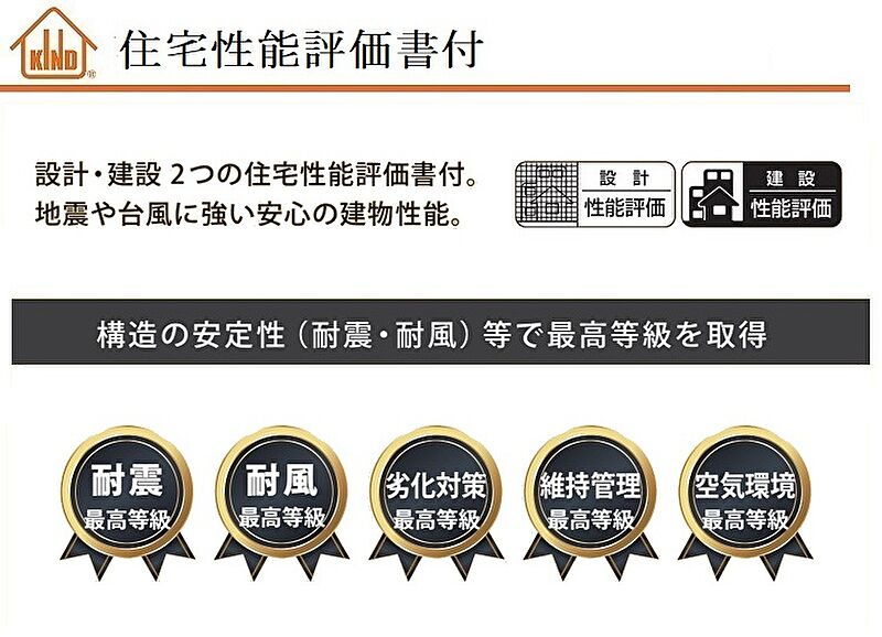 地震や防風に強く、耐震・耐風性能等において最高等級!断熱性能にもこだわり等級5をクリア。エコロジーで快適性が高く、お財布にもやさしい住まいです。