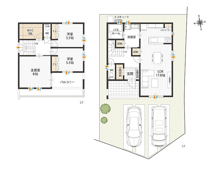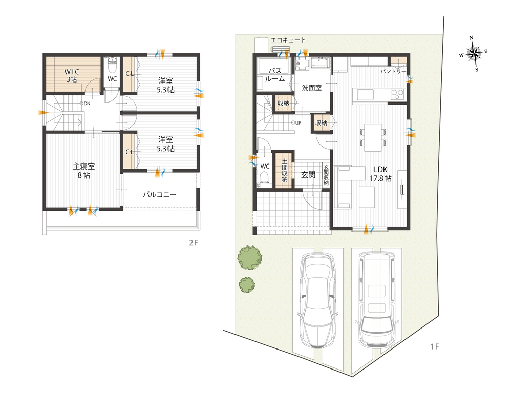 敷地面積42坪超!多面採光で自然光に包まれる《2階建×3LDK》が誕生しました。車2台並列駐車も可能(車種による)。入出庫がしやすく、セカンドカー計画も安心です。