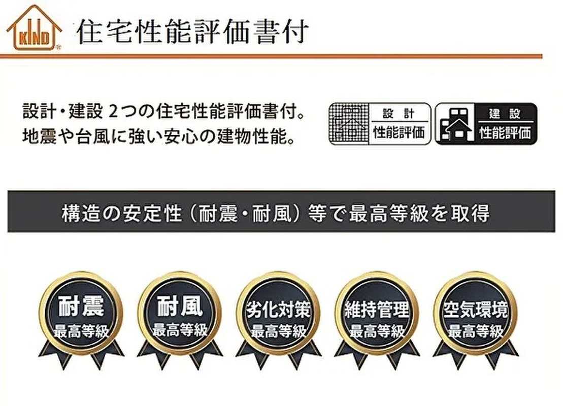 地震や防風に強く、耐震・耐風性能等において最高等級!断熱性能にもこだわり等級5をクリア。