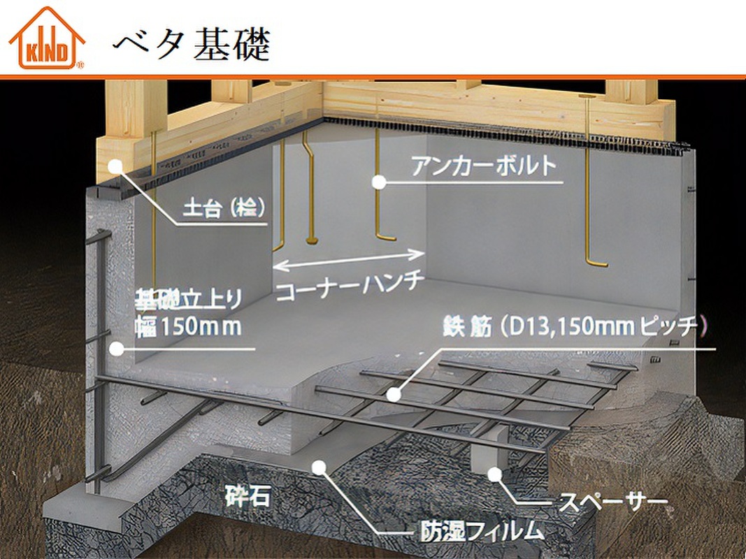 KINDは全物件で徹底した地盤調査を行い、必要に応じて強固な地盤改良を実施。地盤沈下などを20年間保証しています。ベタ基礎がしっかりと建物を支え、お引き渡し後も定期訪問のアフターサービスも。