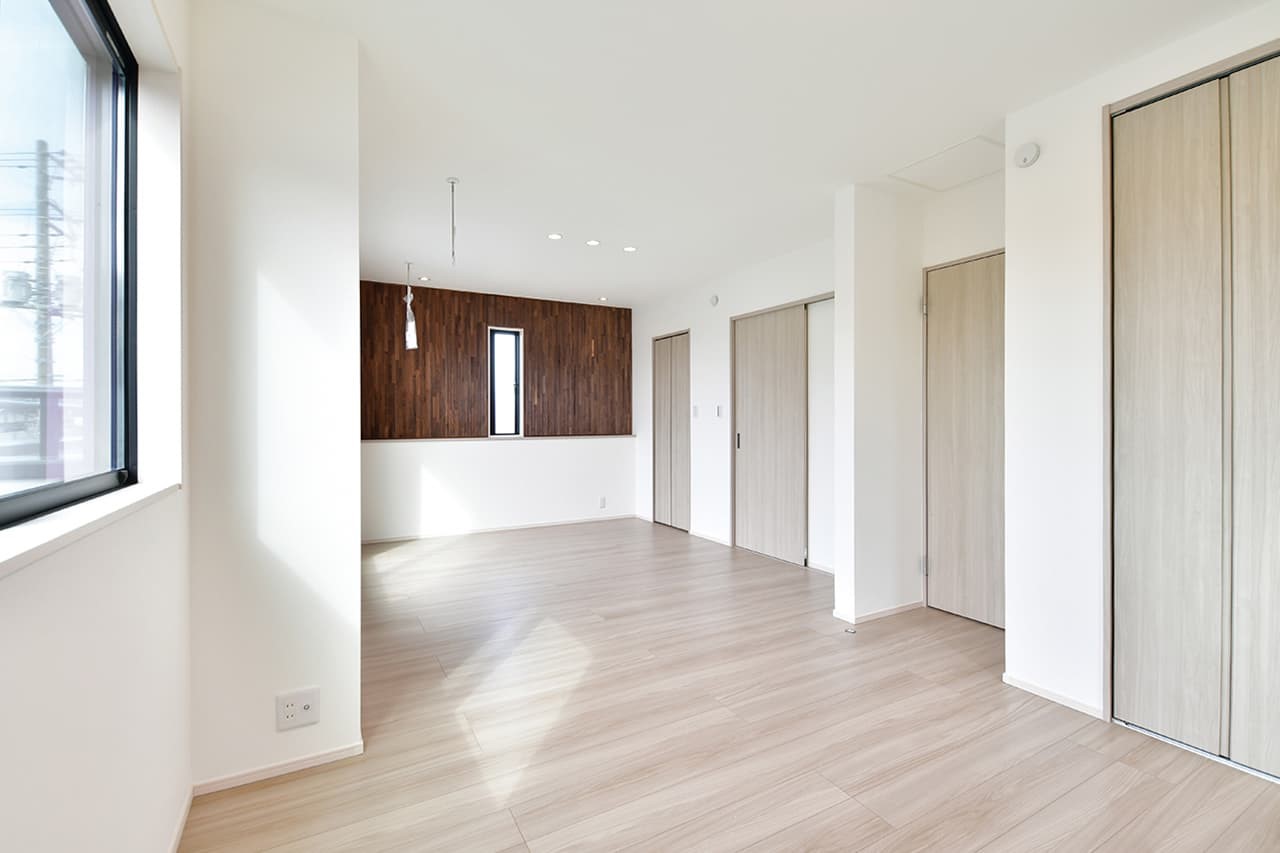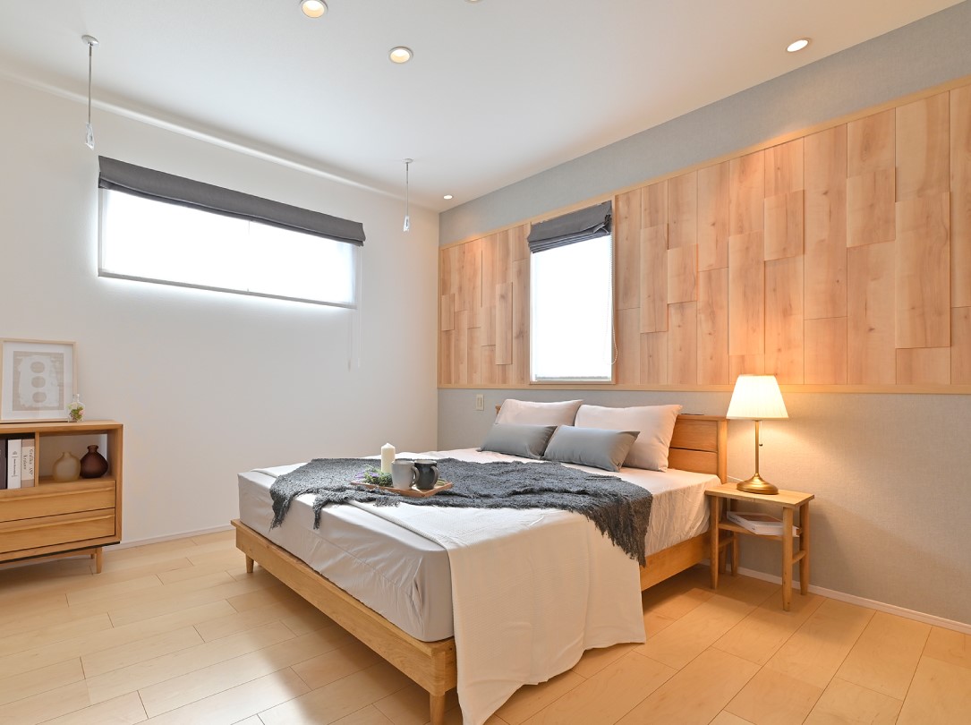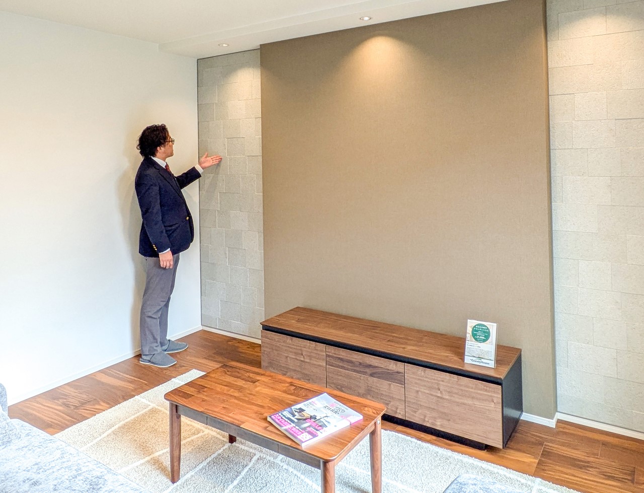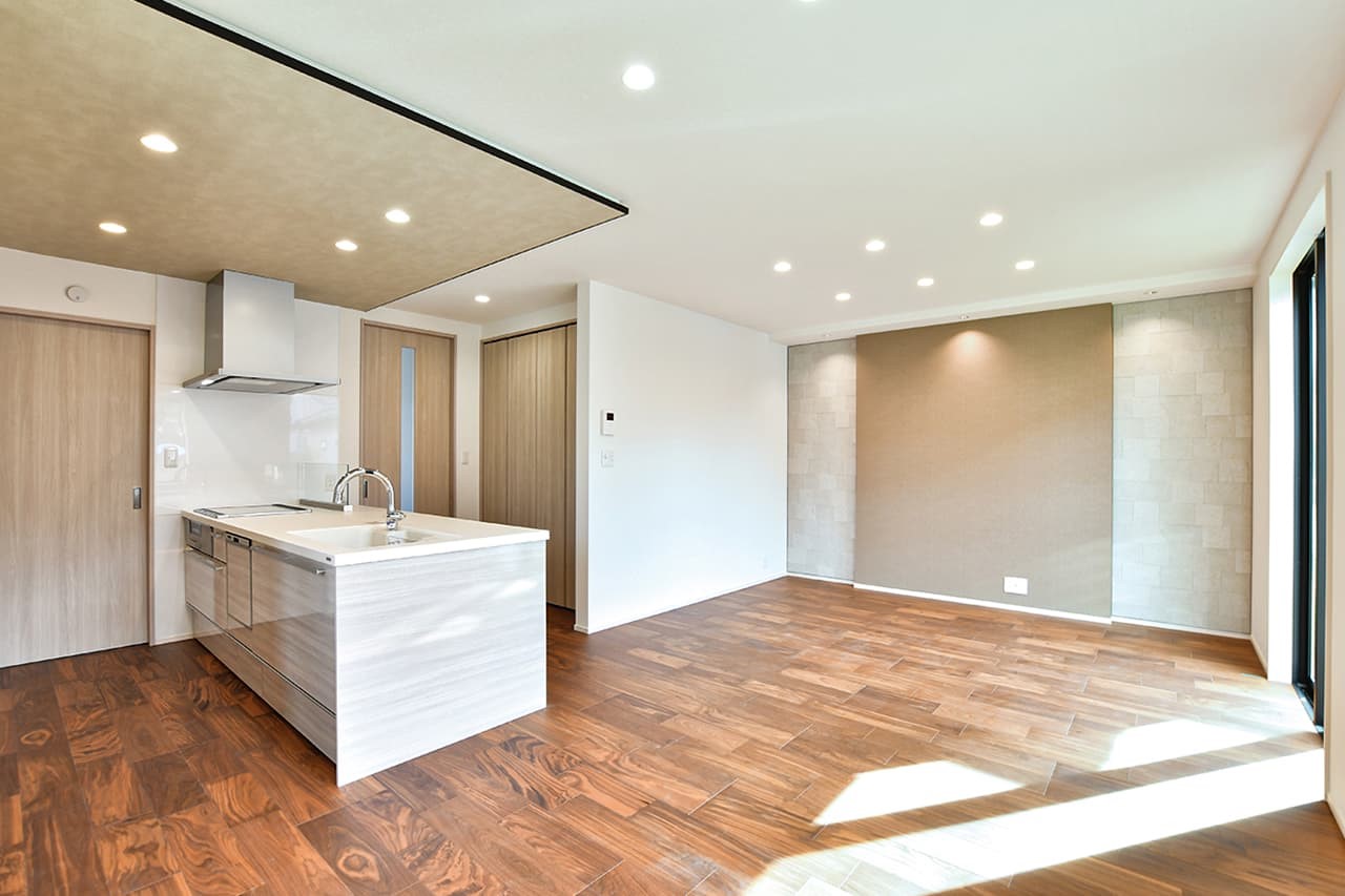 断熱・省エネ性能に優れたZEH水準住宅 / 自然素材のやわらかな質感が空間に落ち着きをもたらすアクセントウォール / 天然木のありのままの美しさを持ちながら、傷つきにくく汚れにも強い床材
