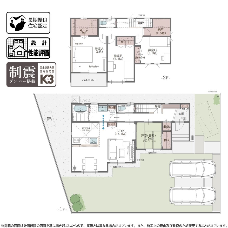 ウォークインクローゼットや納戸など収納豊富な間取り♪ / 災害復旧の早いオール電化住宅 / 耐震等級3で設計・施工 / カースペース2台標準。※3台目以降は要オプション工事(別途費用)