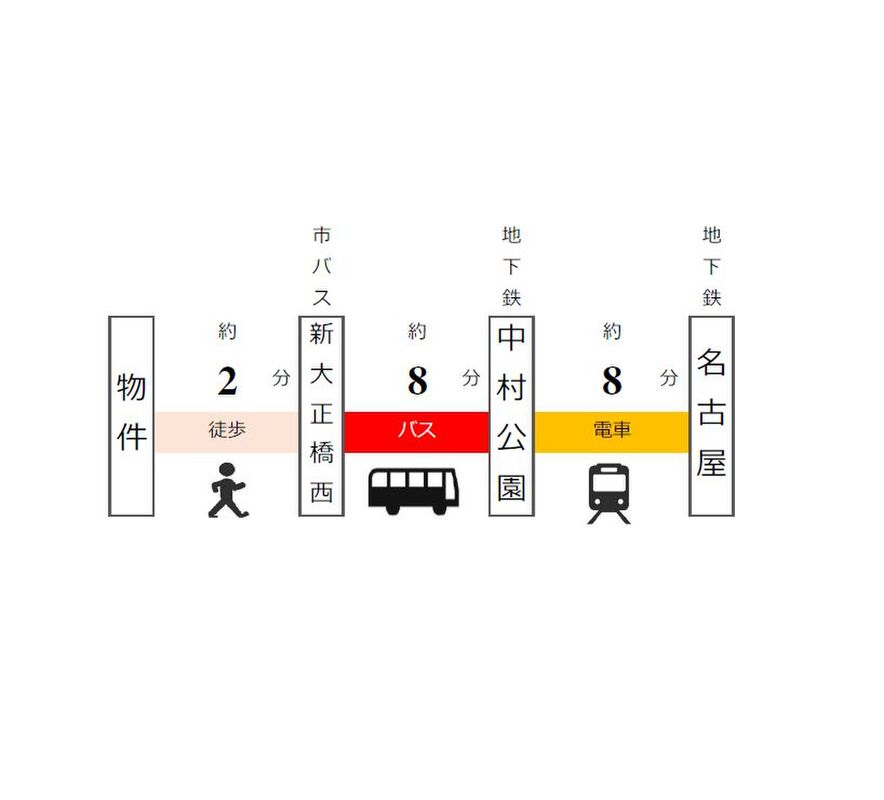 名古屋市営東山線「中村公園」駅 名古屋市営バス8分 「新大正橋」バス停 徒歩33分 |