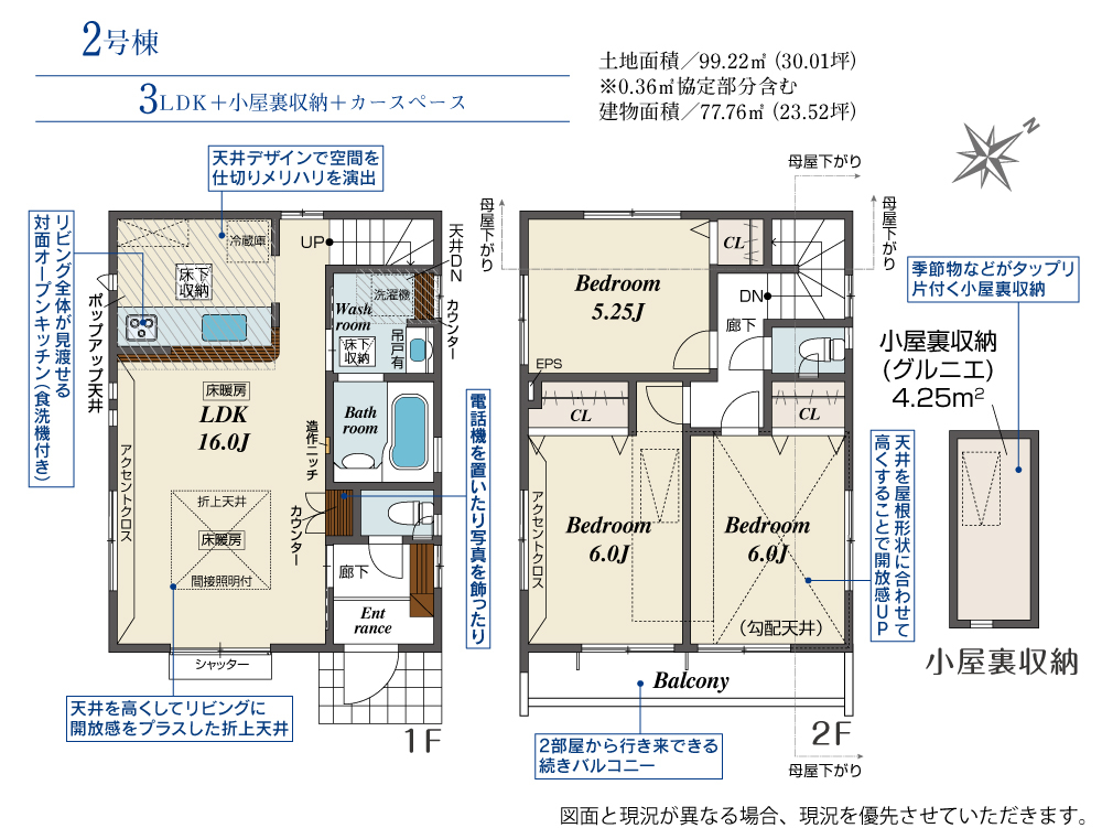 | 建物面積 | 77.76m2(約23.52坪)~78.96m2(約23.88坪) | 土地面積 | 99.21m2(約30.01坪)~99.22m2(約30.01坪) |