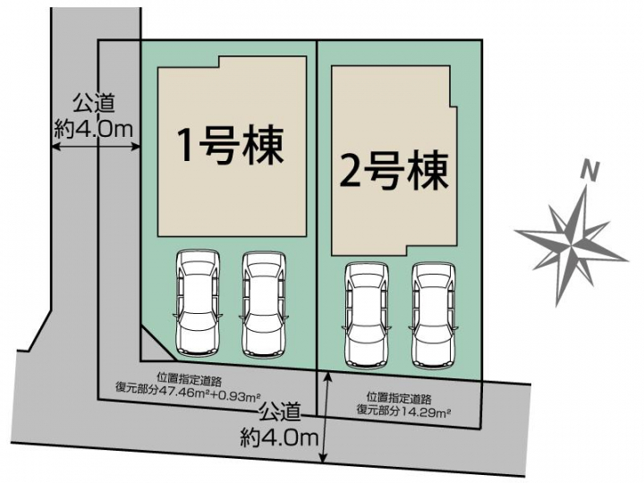 | 駐車場 | 2台 | 道路の幅員 | 西4.0m公道、南4.0m公道 |