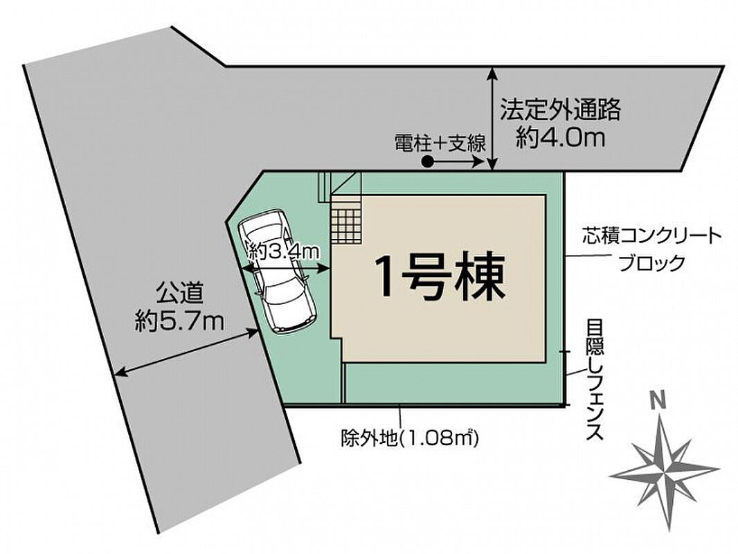 | 駐車場 | 1台 | 道路の幅員 | 西5.7m公道、北4.0m法定外 |