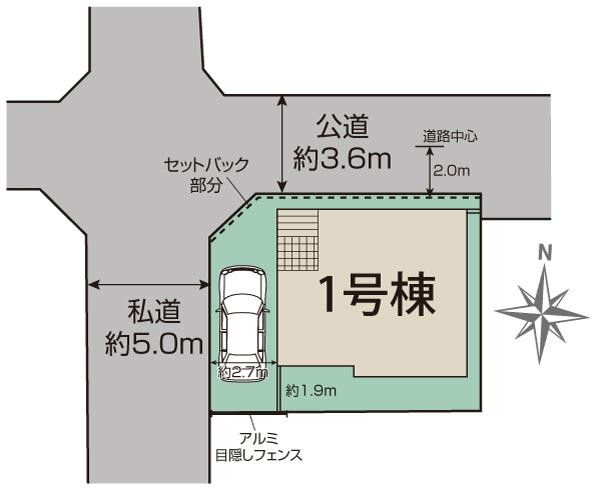 | 駐車場 | 1台 | 道路の幅員 | 西5.0m私道、北3.6m公道 |