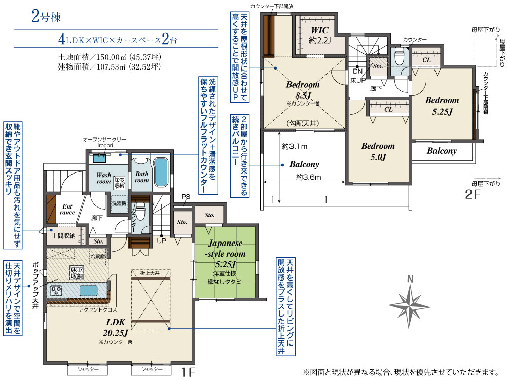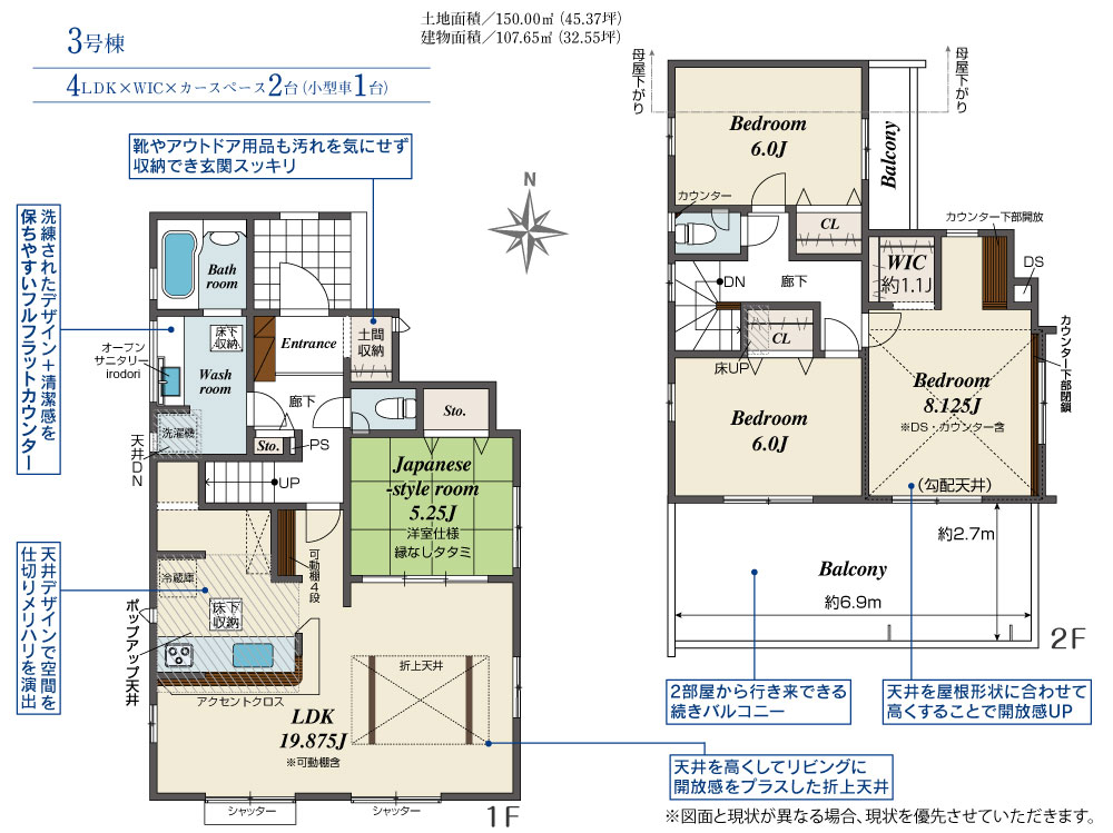 | 建物面積 | 107.53m2(約32.52坪)~107.65m2(約32.56坪) | 土地面積 | 150.00m2(約45.37坪) |