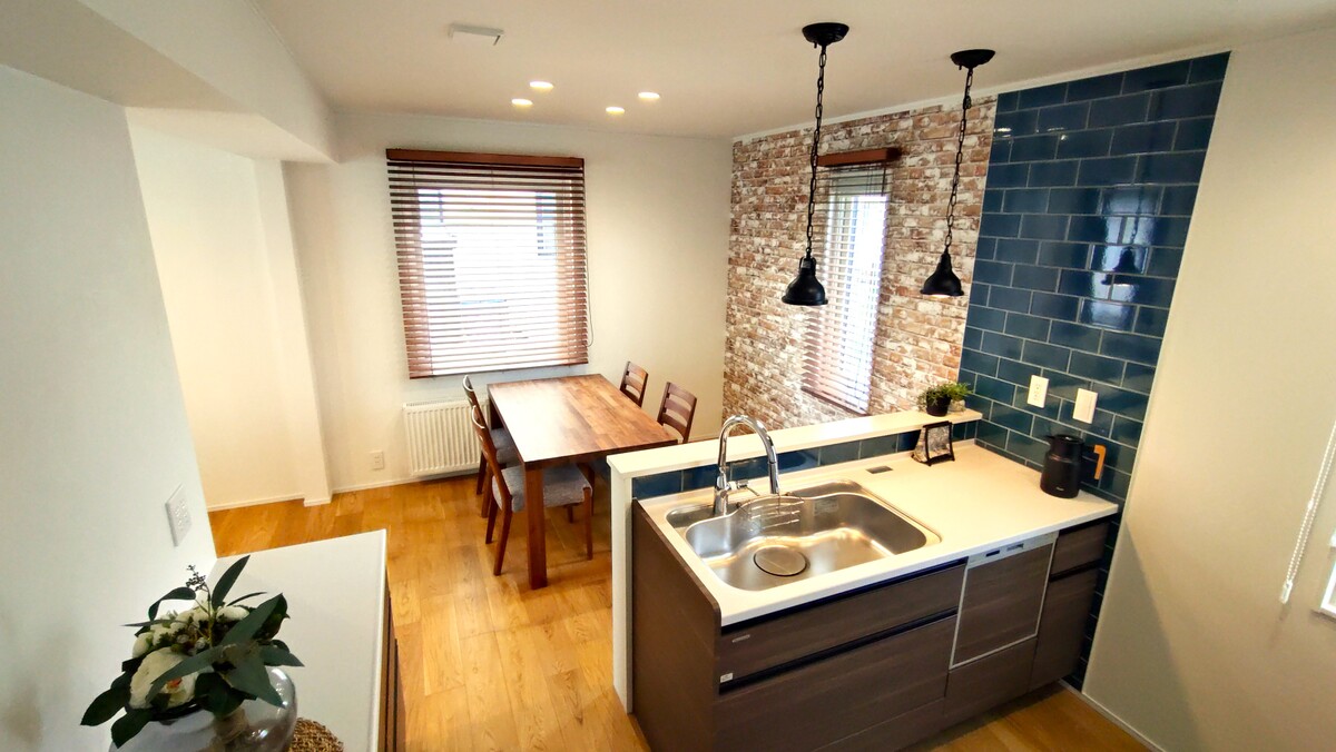 壁面にアクセントクロスを用い、ダークブラウンを基調としたシックレトロなカフェ風のインテリア。玄関からキッチンまで回遊動線でつながっているため、家事や移動が快適です。