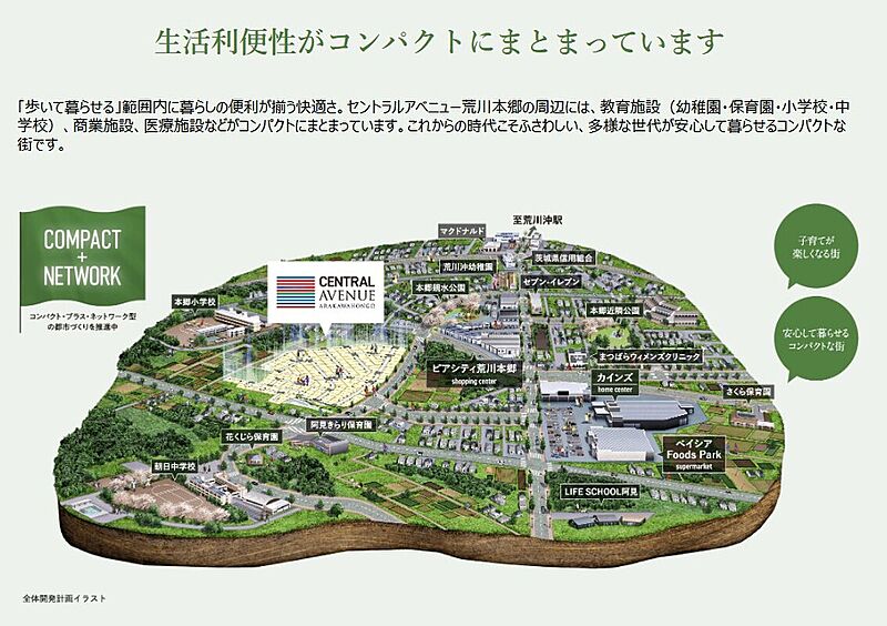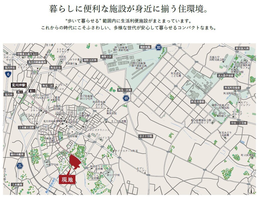 商業施設が充実した阿見荒川本郷エリア。大手ハウスメーカーが手掛ける全175区画の分譲地で、景観の整った美しい街並みが維持されています。