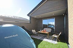 ルーフバルコニーで家族や友人とのBBQやパーティー、小さなお子さんの遊び場、ワンちゃんがのびのび走り回れる場所など暮らしを彩る家族皆の特別空間!水道・屋外用コンセント・照明が嬉しい標準装備!