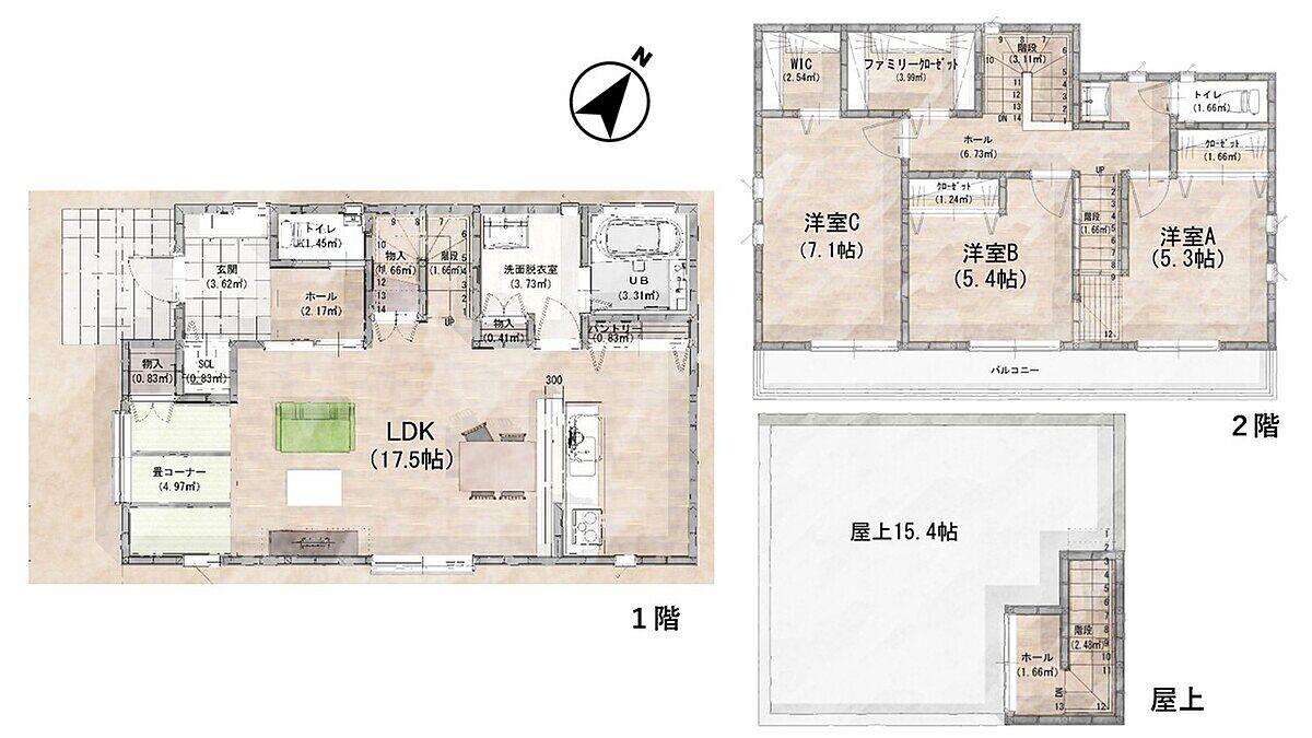 | 間取り | 3LDK+畳コーナー+ファミリークローゼット+屋上 | 建物構造 | 木造2階建 |