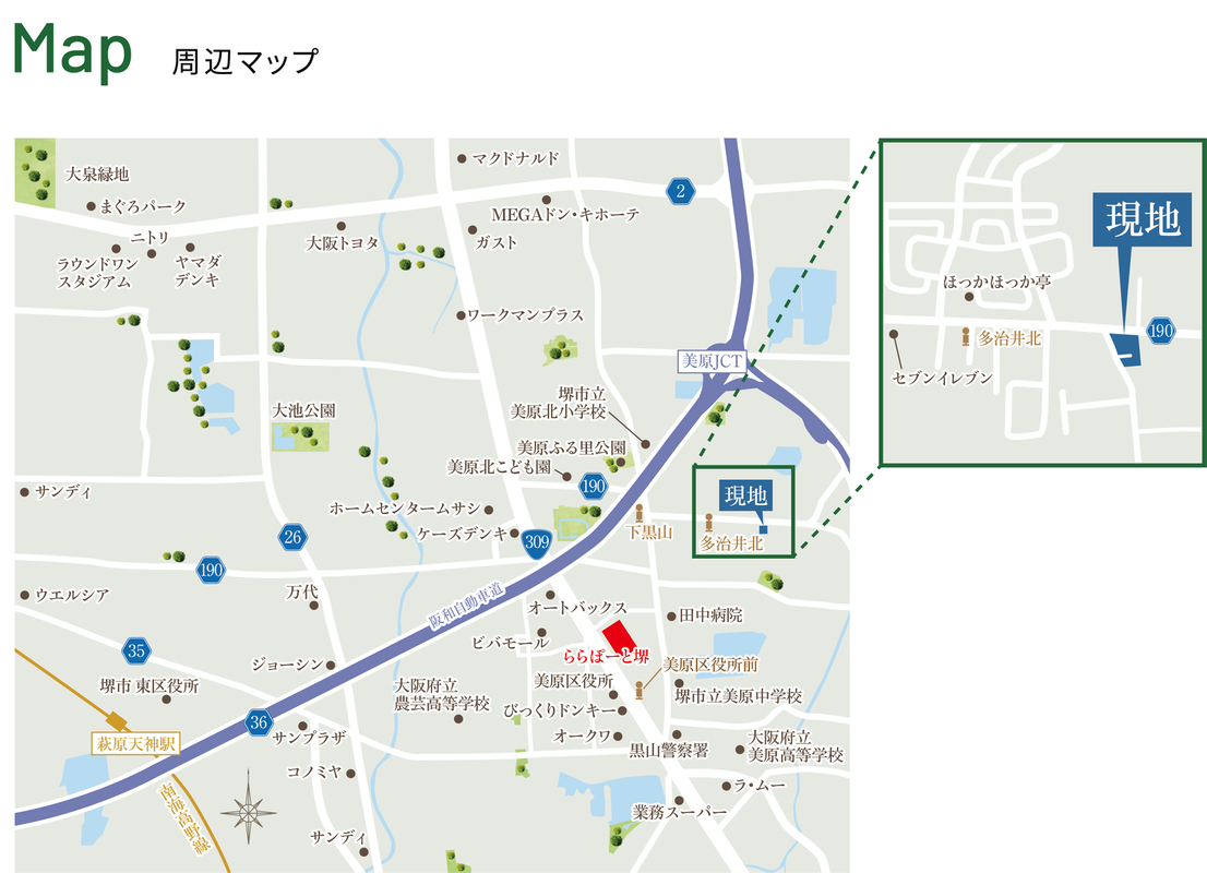 休日は映画やショッピングを楽しめる「セブンパーク天美」、住まいに役立つアイテムが豊富な「ハンズマン松原店」、家計に優しい食品が揃う「ラ・ムー堺美原店」など、暮らしに欠かせない施設が身近に。子どもと一緒にお出かけしたり、趣味やDIYを楽しんだり、日常をもっと豊かに彩る環境が整っています。子育て世代のご家族にぴったりの利便性と安心感が、この分譲地の大きな魅力です。
