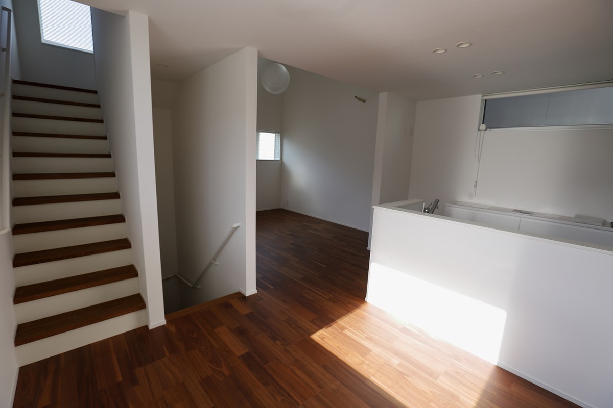 周辺には「若久公園」や「野間大池公園」があり、自然を感じながらの散歩やジョギング、家族でのピクニックが楽しめます。 また、幼稚園や保育園も多く、共働き家庭や子育て世代にも優しいエリアです。 <2階から3階に広がる吹抜け。ほどよい家族の距離感と開放的な空間に。> 若久1丁目コンセプトハウスの敷地面積は20坪ほど。ですが、室内入ればそれを感じさせない空間の広がりがあります。 その広がりをもたせてくれている吹抜けは、2階のリビングから3階の個室へとつながっています。吹抜けがあることで、それぞれが別のことをしていても家族の気配を感じられる空間にしてくれます。
