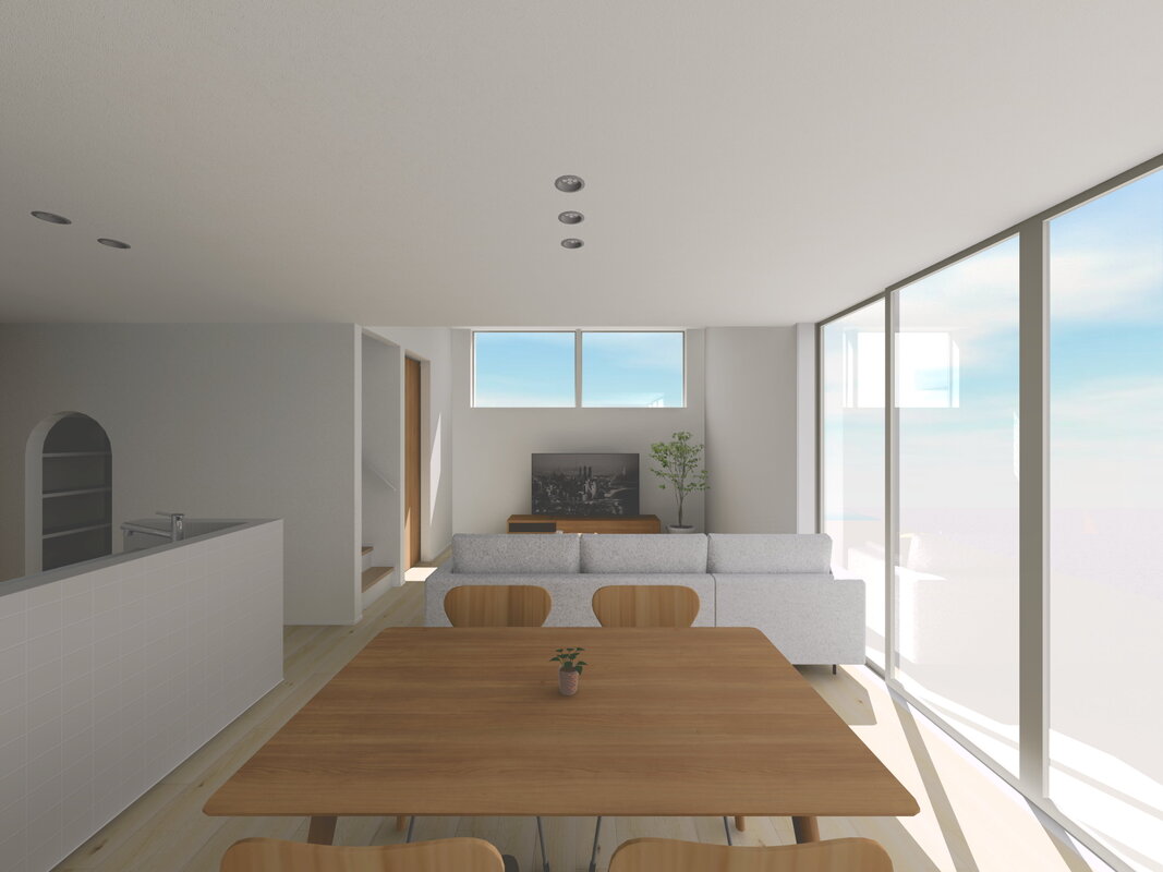 大きな窓から柔らかな光が差し込み、家族が自然と集まる心地よいリ...