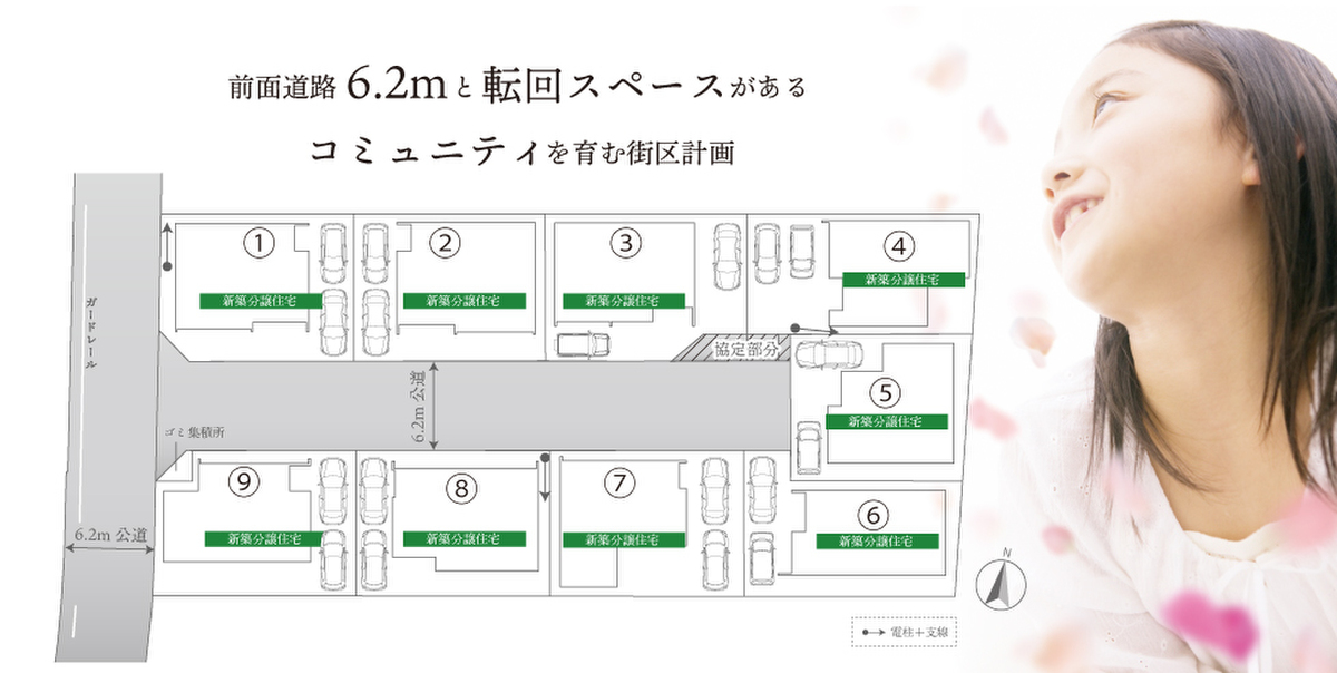 | 駐車場 | 1台 ~ 2台(区画により2台以上可能。) | 道路の幅員 | 西側6.2m公道・南側新設道路6m公道 |