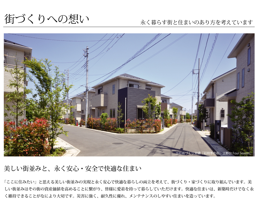 当社ではどの分譲地も同様に、街づくり・家づくりに共通した想いを込めています。住む方が幸せになる街と家にする為の想いを感じていただければ幸いです。