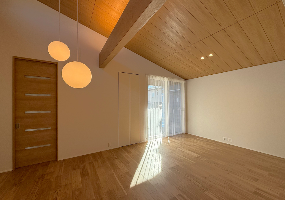 【2号棟】平屋住宅、屋根勾配を活かした大きな吹き抜け空間を採用したリビング、書斎コーナー採用【4号地】平屋住宅、大きな吹抜の上部から明るい光を取り込むリビング、大容量ファミリークローゼット採用