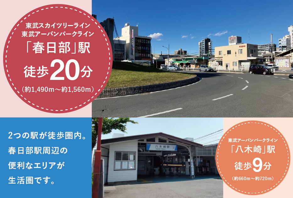 東武野田線「春日部」駅 徒歩19分~20分 東武野田線「八木崎」駅 徒歩9分 東武野田線「豊春」駅 徒歩23分~24分 |