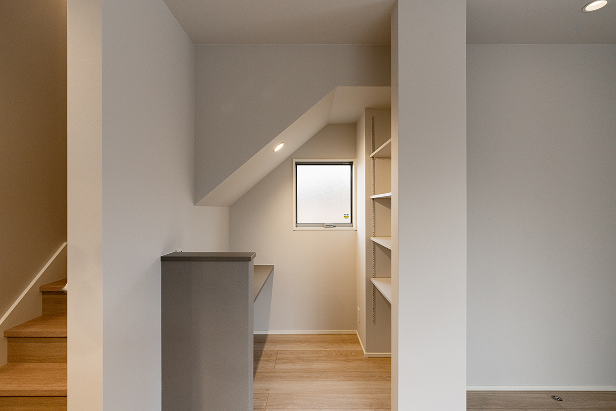 「見守る家」は、2つの造り付け家具を設けた住まい。LDKにはテレビカウンター、スタディコーナーにはデスクカウンターを造作しています。またデスクカウンターは、家事をしながら子どもの勉強を