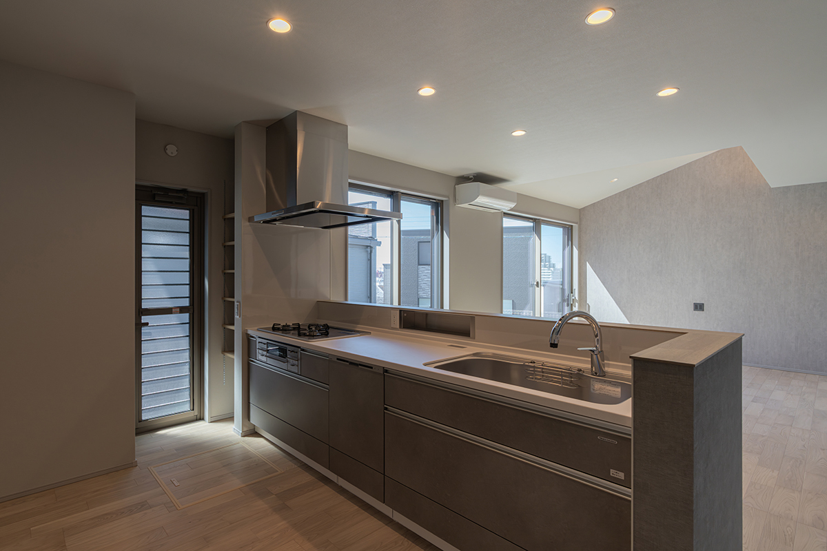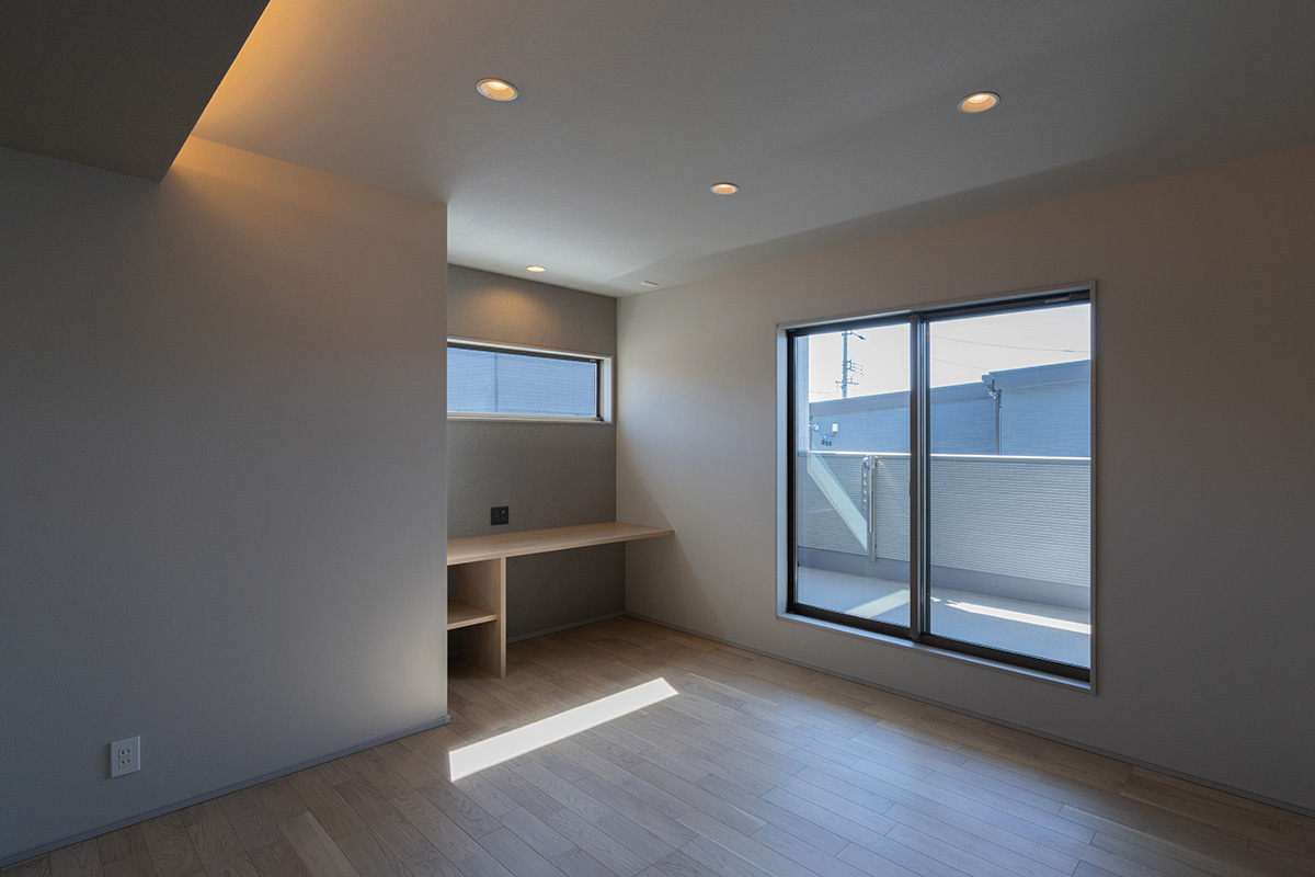 読書や在宅ワークなど、一人で集中する時間を確保できるように、主寝室に書斎コーナーを設けました。またキッチンには日々の家事がスムーズに行えるパントリーと勝手口を備えています。
