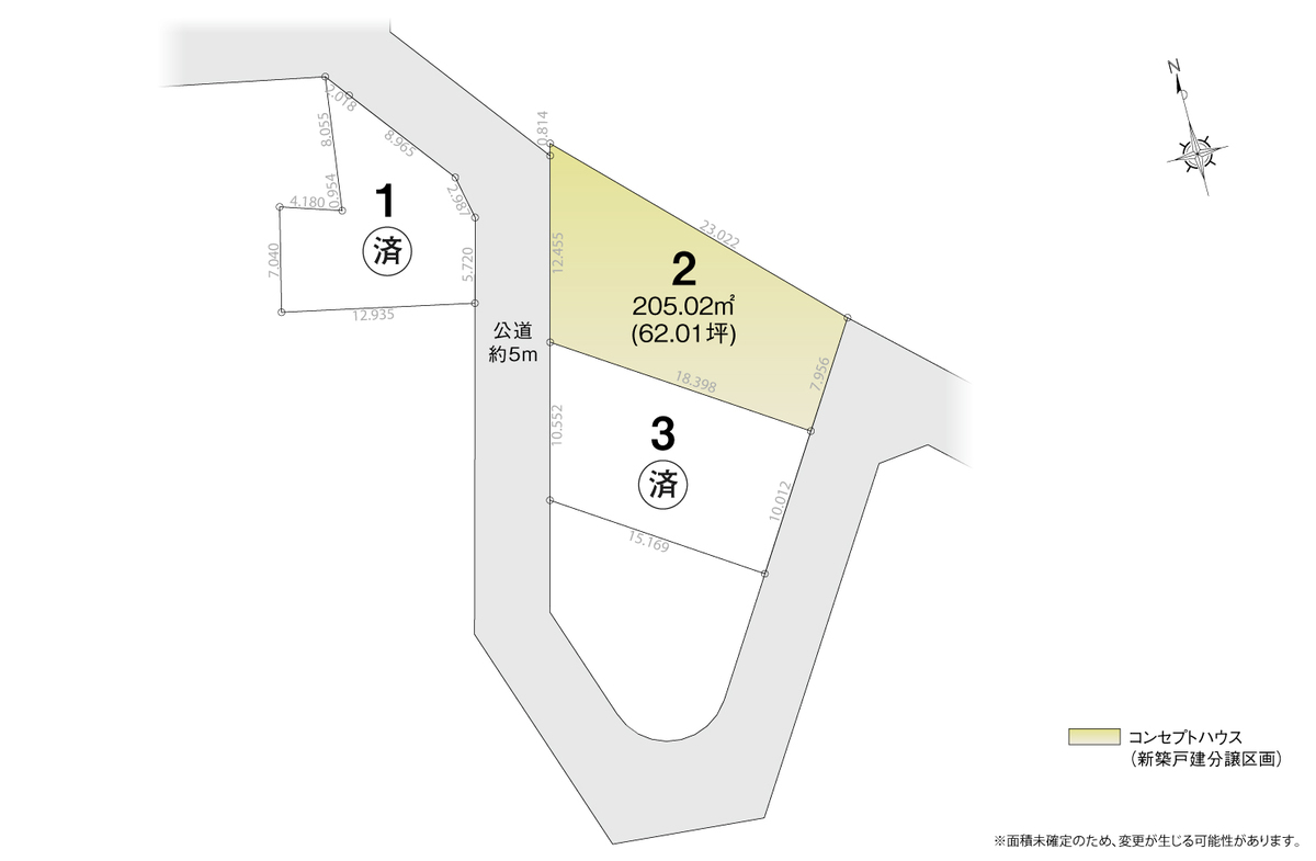 | 駐車場 | 2台 | 道路の幅員 | 西側公道約5m、東側公道約5m |