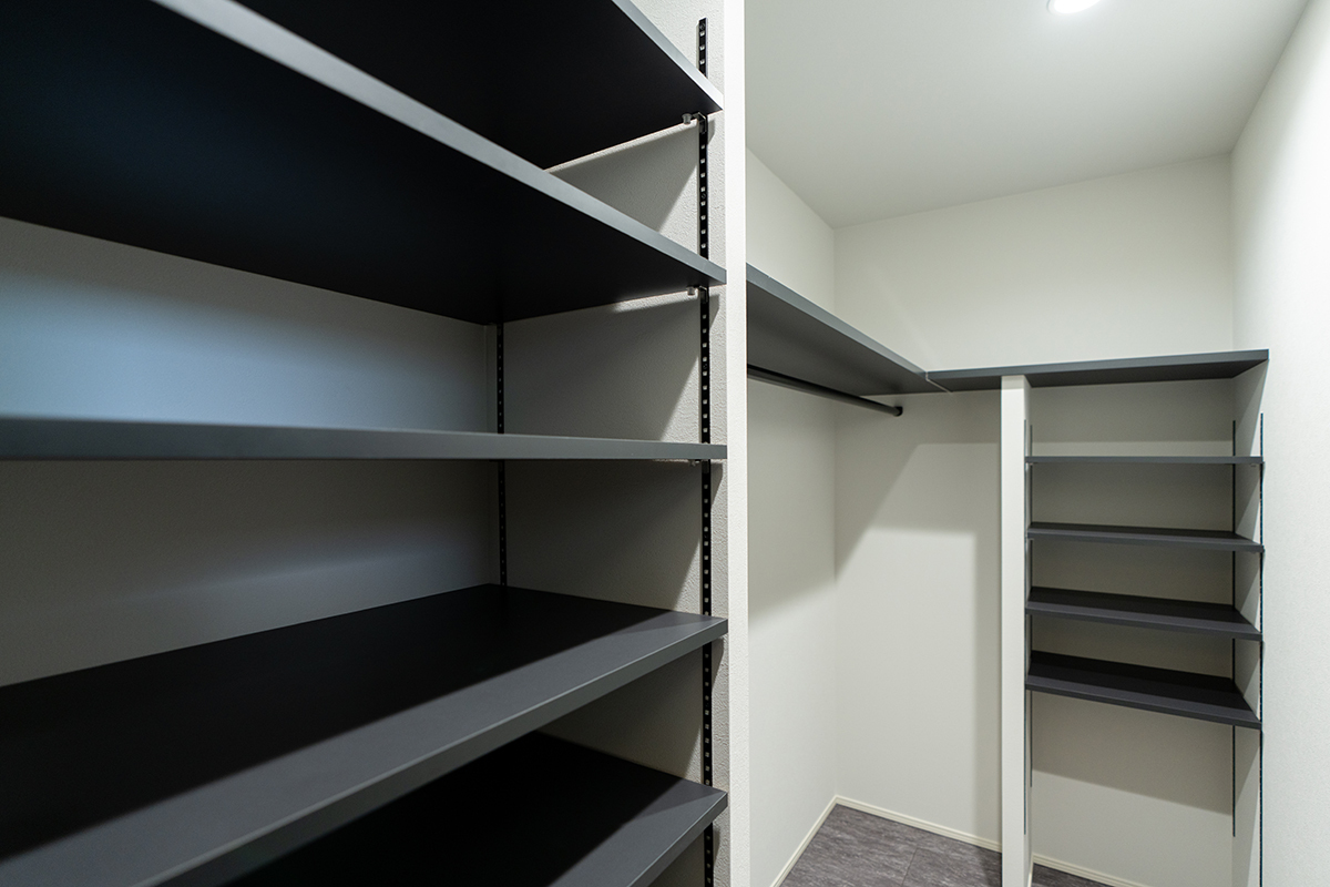 1階に設けたファミリークローゼットは、普段使いの衣服やバッグを収納できるだけでなく、一部はパントリーとしても活用できます。洗面室と近いため、乾かした洗濯物をスムーズに収納することも可能。