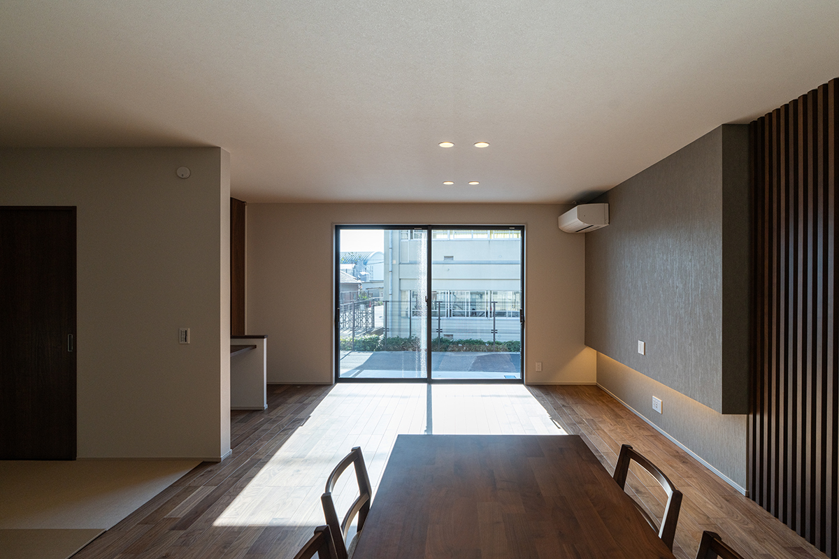 重厚感のある外観が印象的な住まい。和室は置き畳を採用しており、和室としても洋室としても使用できます。また広々としたバルコニーは物干しスペースだけでなく、寛ぎの屋外テラスとしても活用できます。