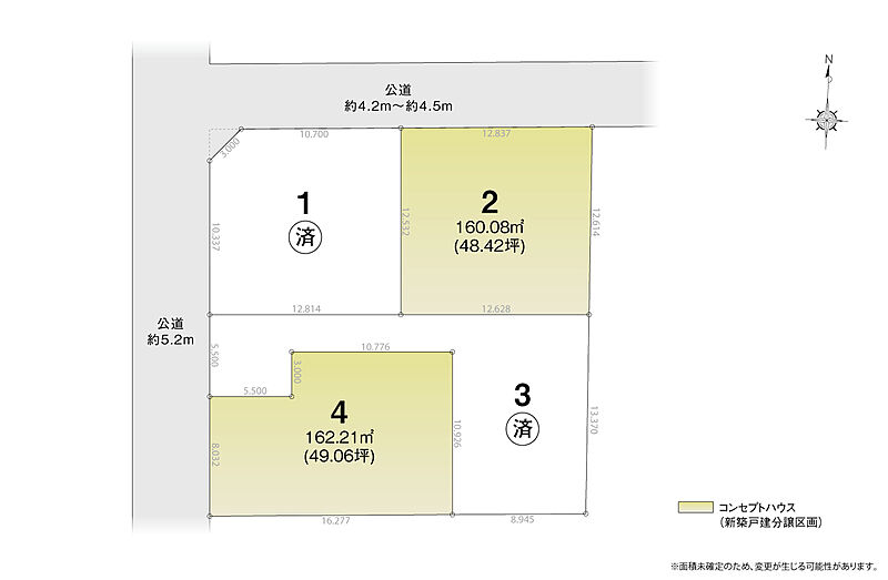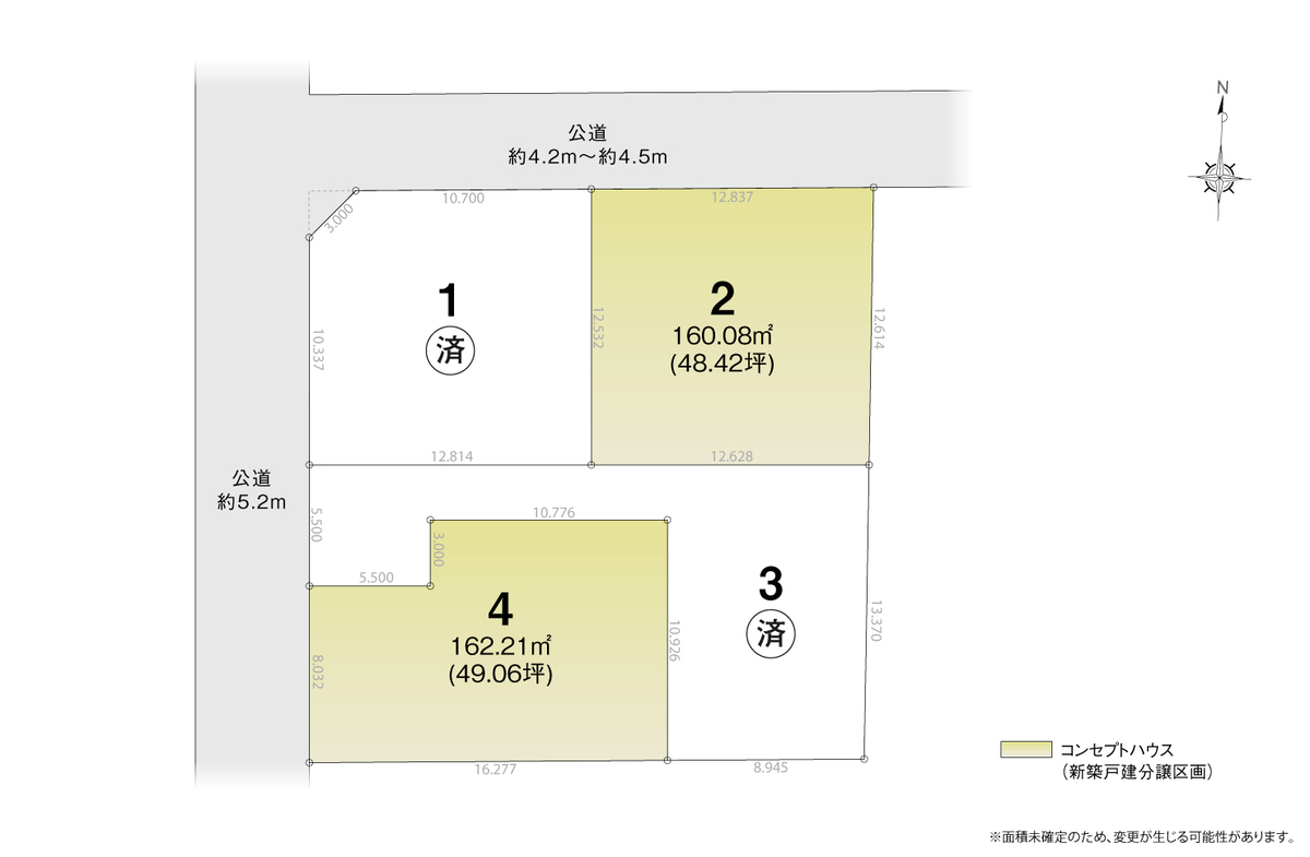 | 駐車場 | 2台 | 道路の幅員 | 西側公道約5.2m、北側公道約4.2~約4.5m |