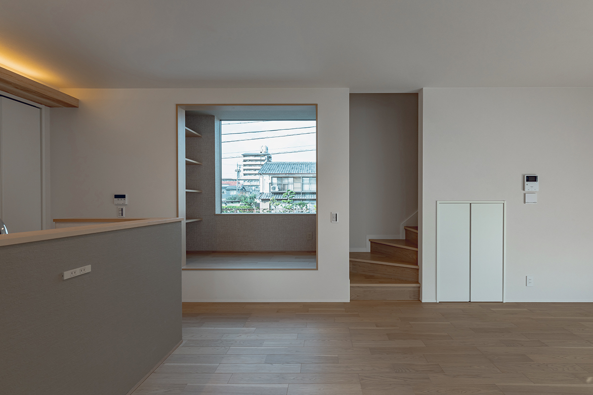 「窓辺にヌックがある家」の玄関や洗面室から近いファミリークローゼットは、動線が短いため衣類や日用品の収納など幅広く使えて便利です。またリビングから小上がりになっている窓際のヌックスペースは、
