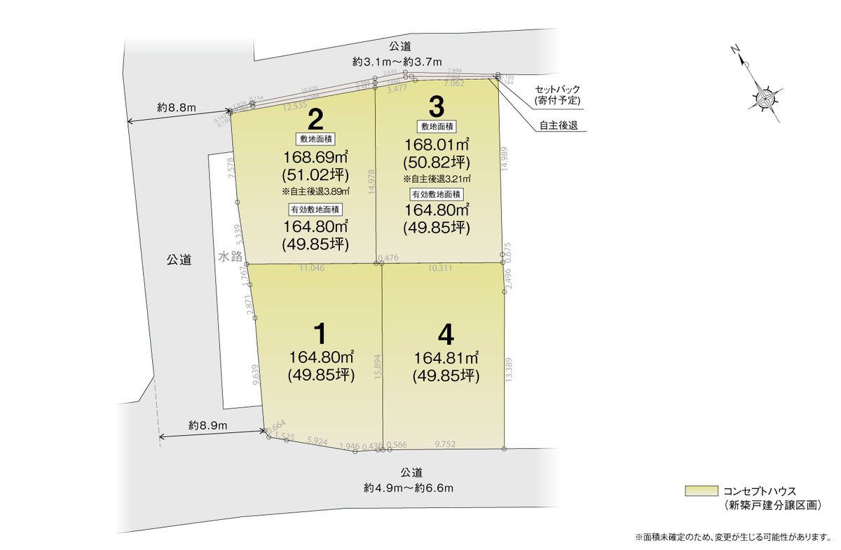 | 駐車場 | 2台 | 道路の幅員 | 南側公道約4.9m~約6.6m、北側公道約3.1m~約3.7m ※セットバック要 面積は備考欄 |
