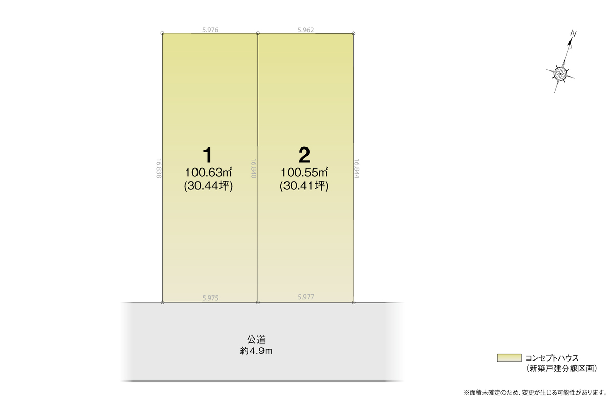 | 建物面積 | 90.68m2(27.43坪)・99.42m2(30.07坪) | 土地面積 | 100.55m2(30.41坪)・100.63m2(30.44坪) |