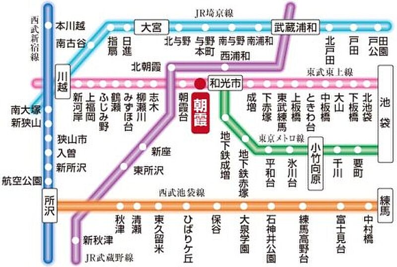 3駅利用可能な交通利便性の良いエリアです。2023年3月より急行停車駅となり、各方面にさらに移動がしやすくなった東武東上線「朝霞」駅。他にも朝霞市にはJR武蔵野線「北朝霞」駅と東武東上線「朝霞台」駅があり、どちらも1本で都心へ出ることが出来ます。