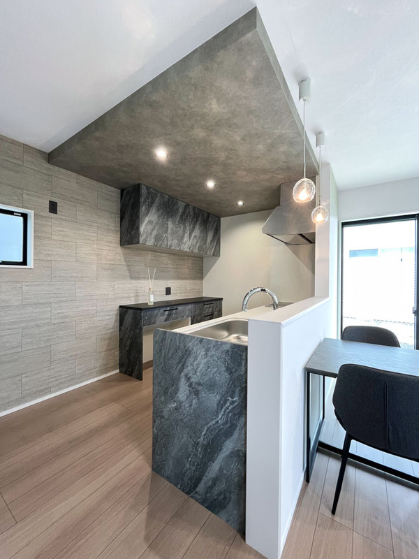 魅力3 ダークな折り下げ天井が印象的 ルンバ基地のある対面キッチン