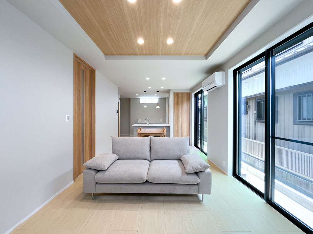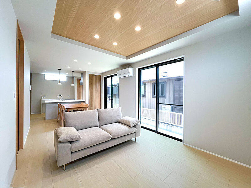 LDK を一直線上に配置して天井の一部を上げ、縦のラインを意識...