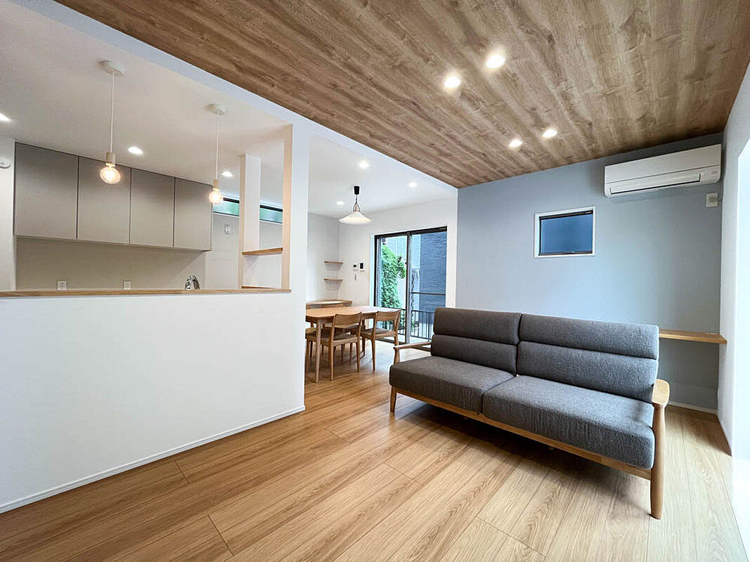 オークの淡い木目柄×水色が爽やかなナチュラルテイストのLDKは、カウンター下収納やニッチなど3か所の「見せる収納」を設けてあり、お気に入りのアイテムで自分らしさを表現できる空間に。