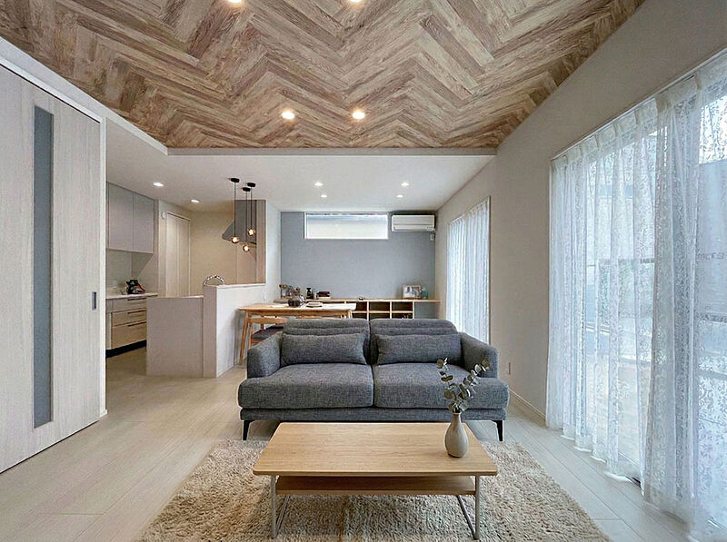 LDK は高天井いっぱいに広がるヘリンボーン柄が見どころです。