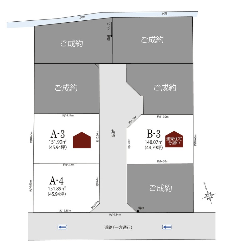 | 駐車場 | 3台(車種による) | 道路の幅員 | 私道約6.00m、間口約10.66m、アスファルト舗装済 |