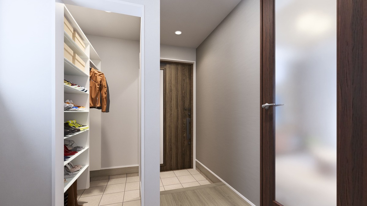玄関は直接ホール側へ行く動線と、クロークを経由してホール側へ行く動線に分けました。来客時はゲストをそのままホール側へ案内することができます。